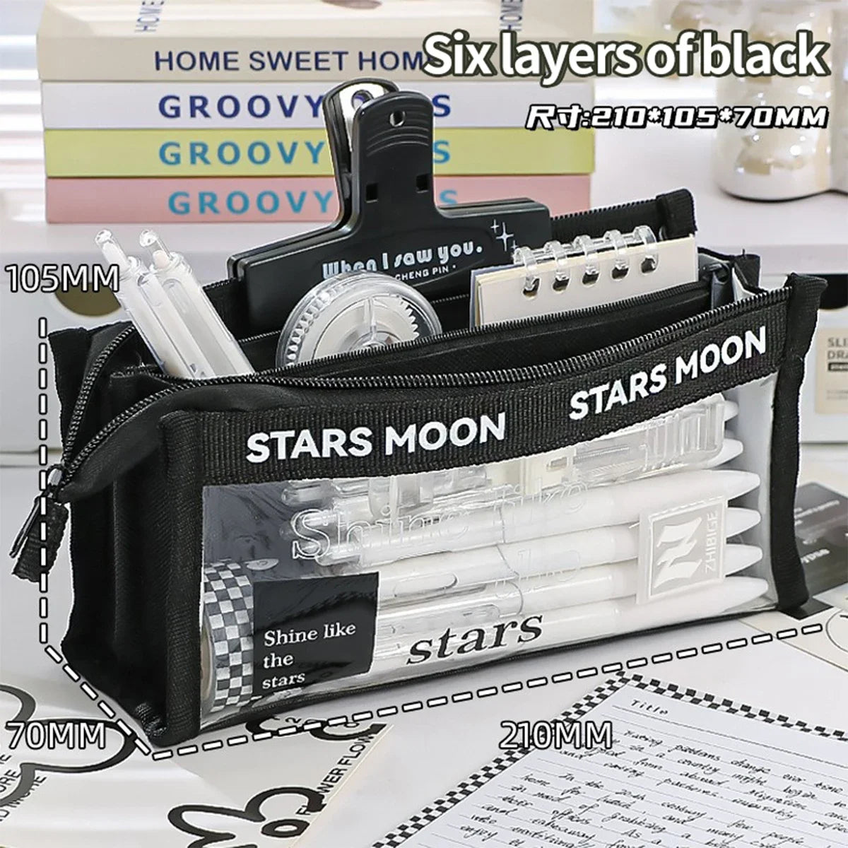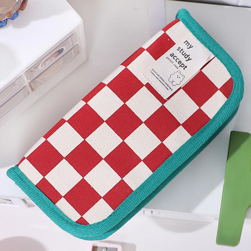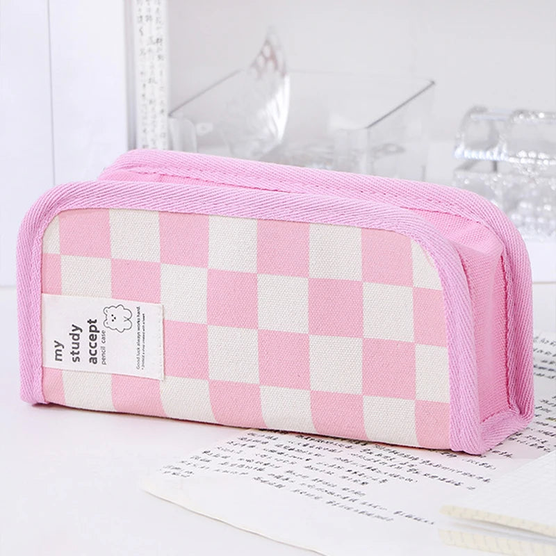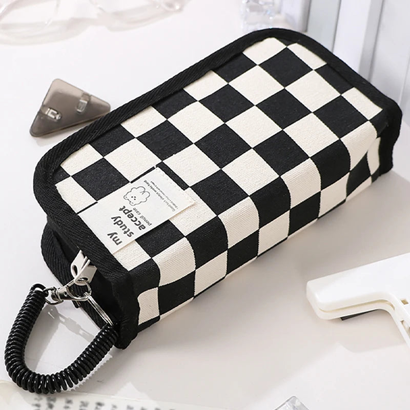 1Pc Large Capacity Pencil Case Black and White Checkerboard Grid Large Storage Pencil Bag Student Canvas Stationery Box