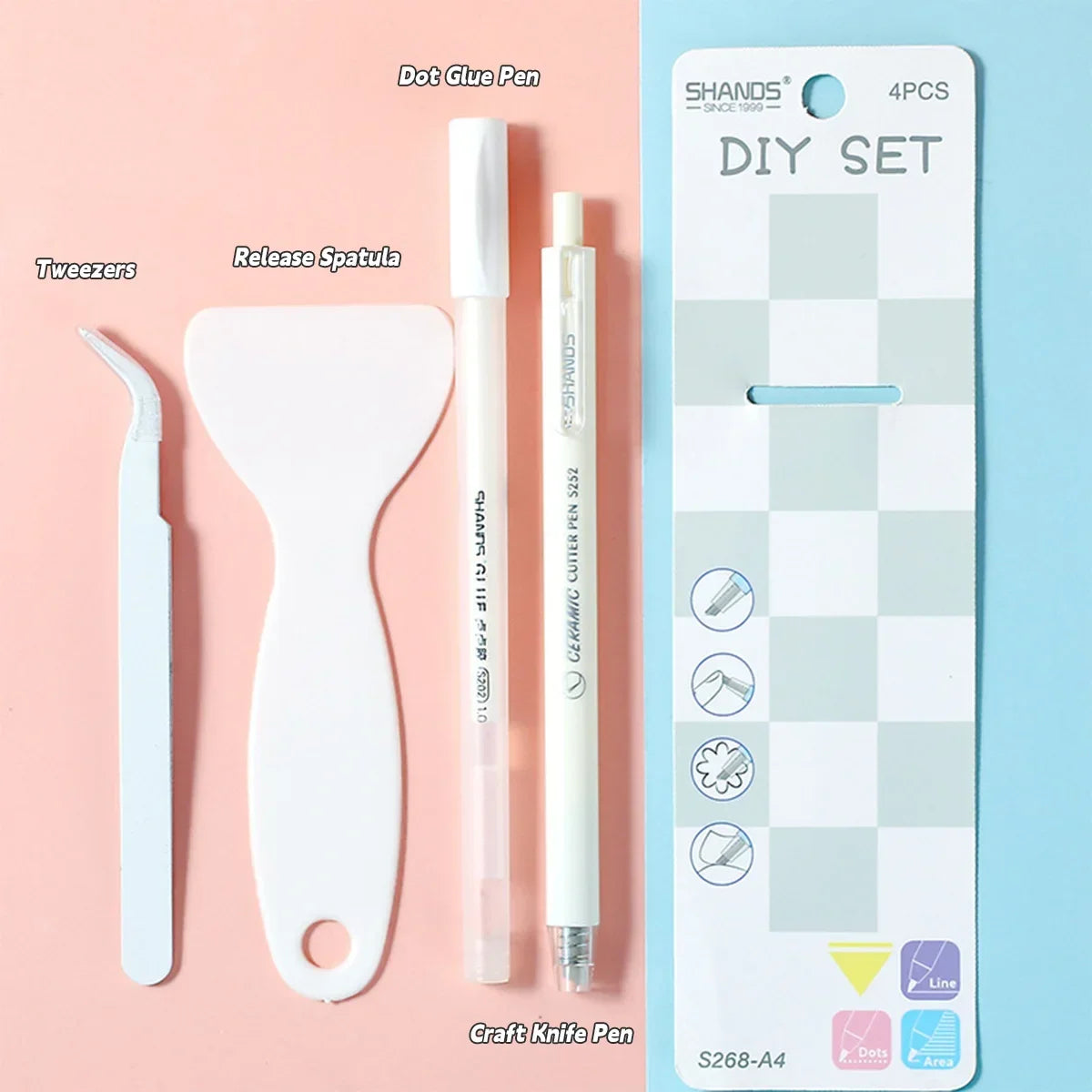 Colors: pink, white, blue, green, orange, etc.