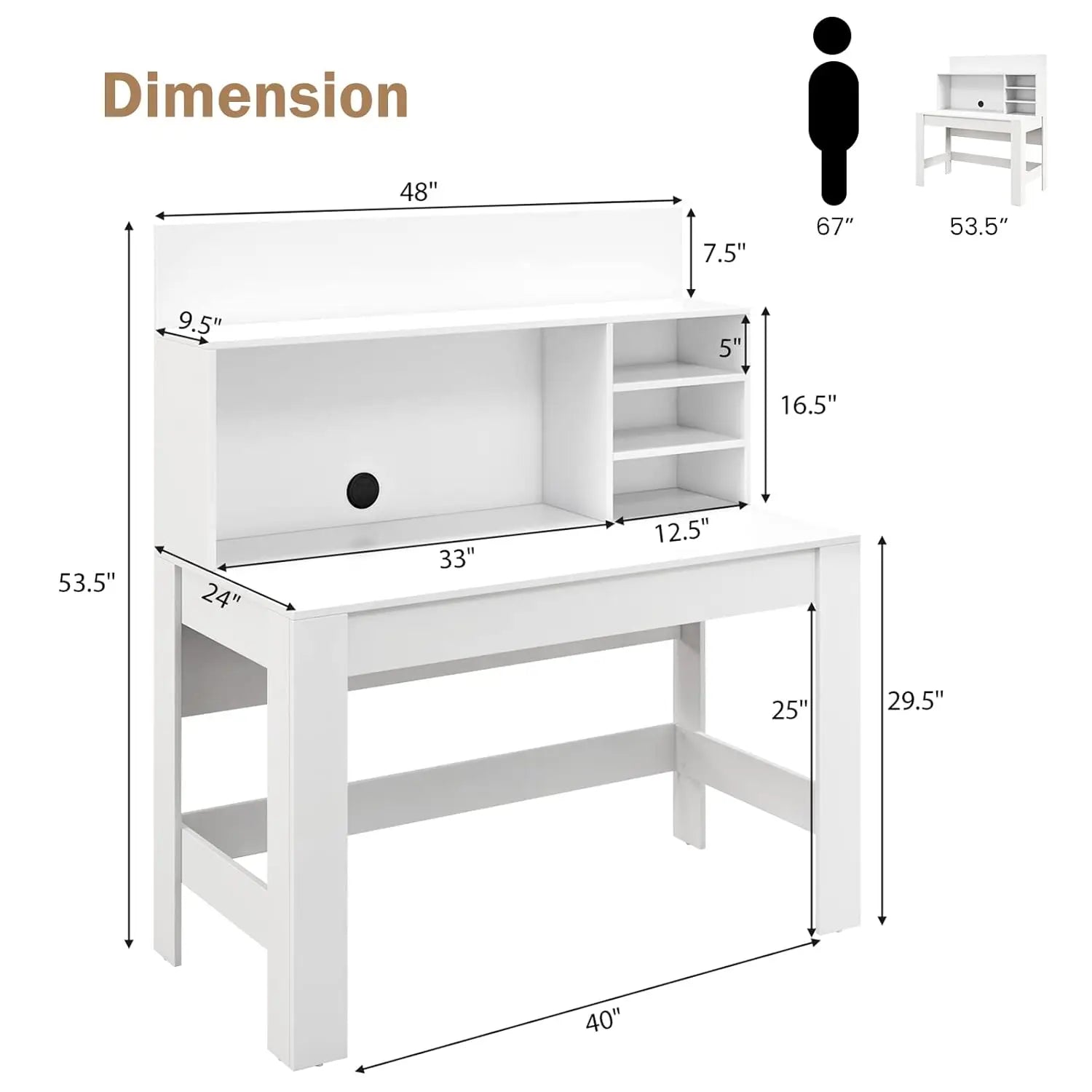 White Desk With Hutch, Home Office Desk With Bookshelf, Writing Study Desk With Anti-Toppling Device & Cable Hole, Modern Comput