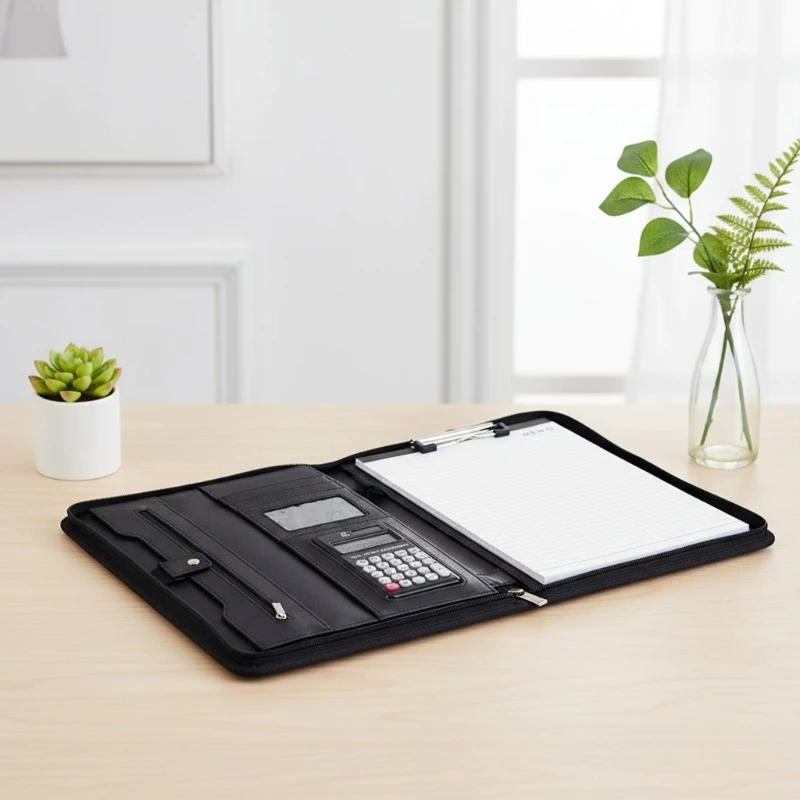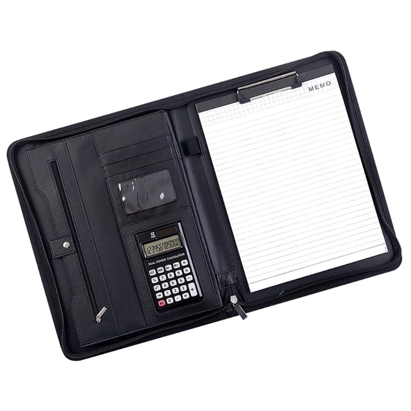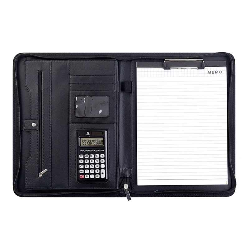 Zippered leather document organiser combines 12 digits calculator with spacious letter size notepads, offering business professional multifunctional conference document organiser case for efficient file paper management and client presentations.