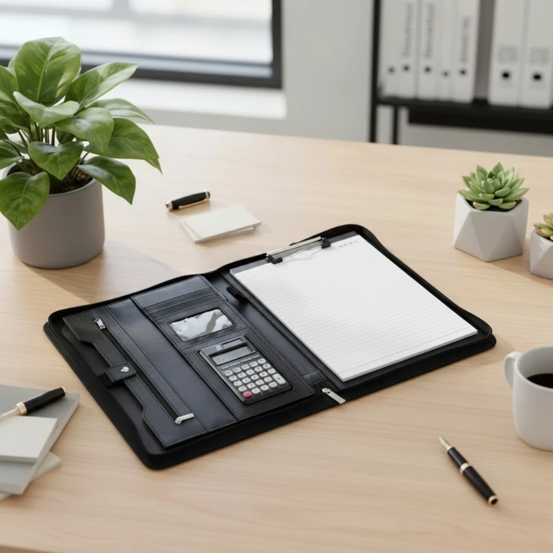 Built in 12 digit calculator and letter size clipboard writing pad, blending professional aesthetics with practical functionality for seamlessly multitasking.